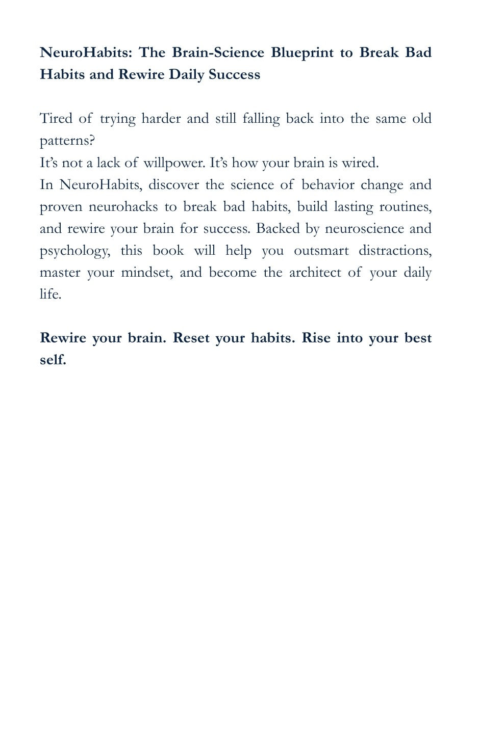 This book shows you why, Neuro Habits isn’t about working harder. It’s about working with your brain, not against it. Grounded in neuroscience and real-world psychology, this book gives you 24+ simple, science-backed tools to help you finally reset your patterns, master your focus, and build habits that actually last.