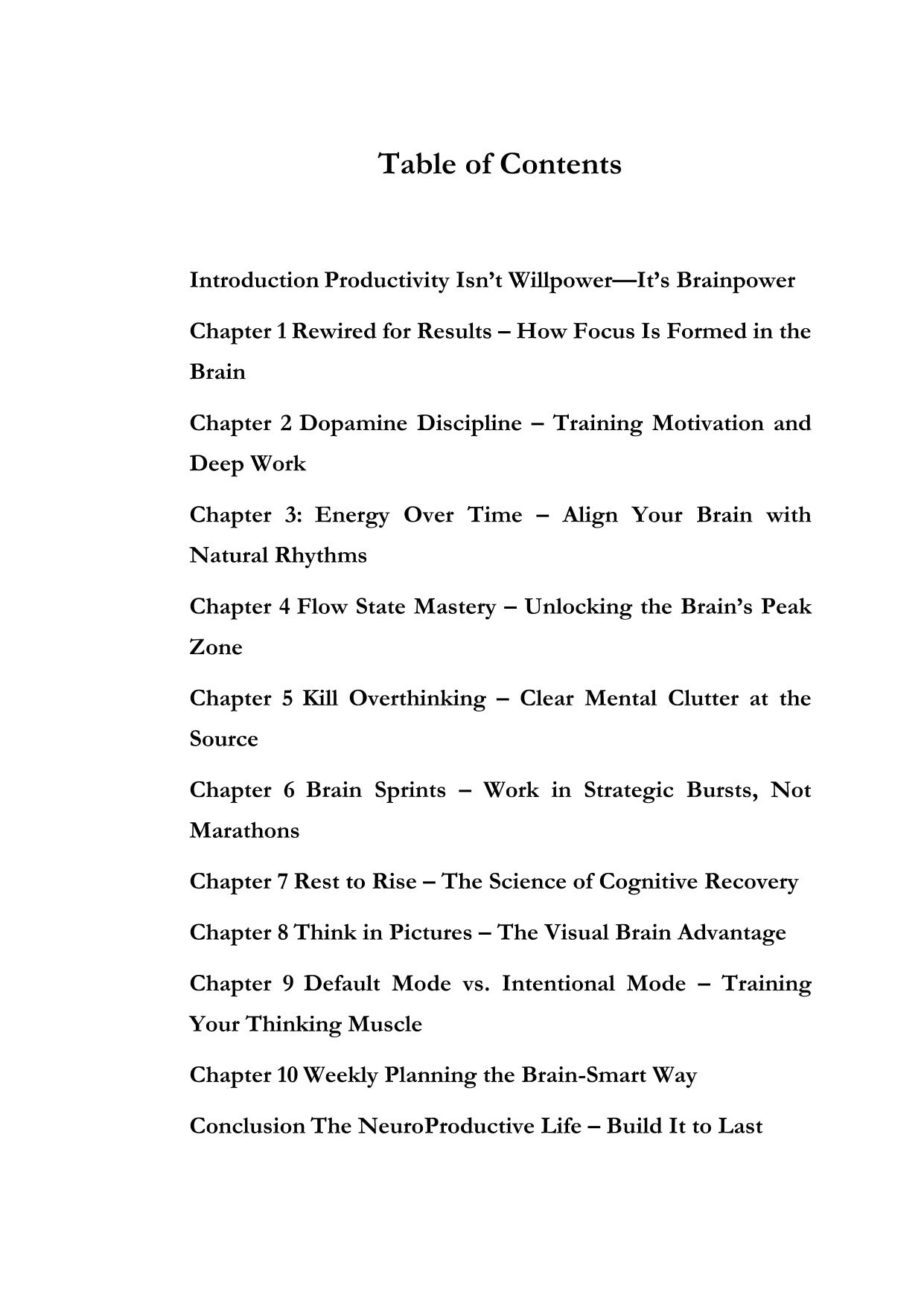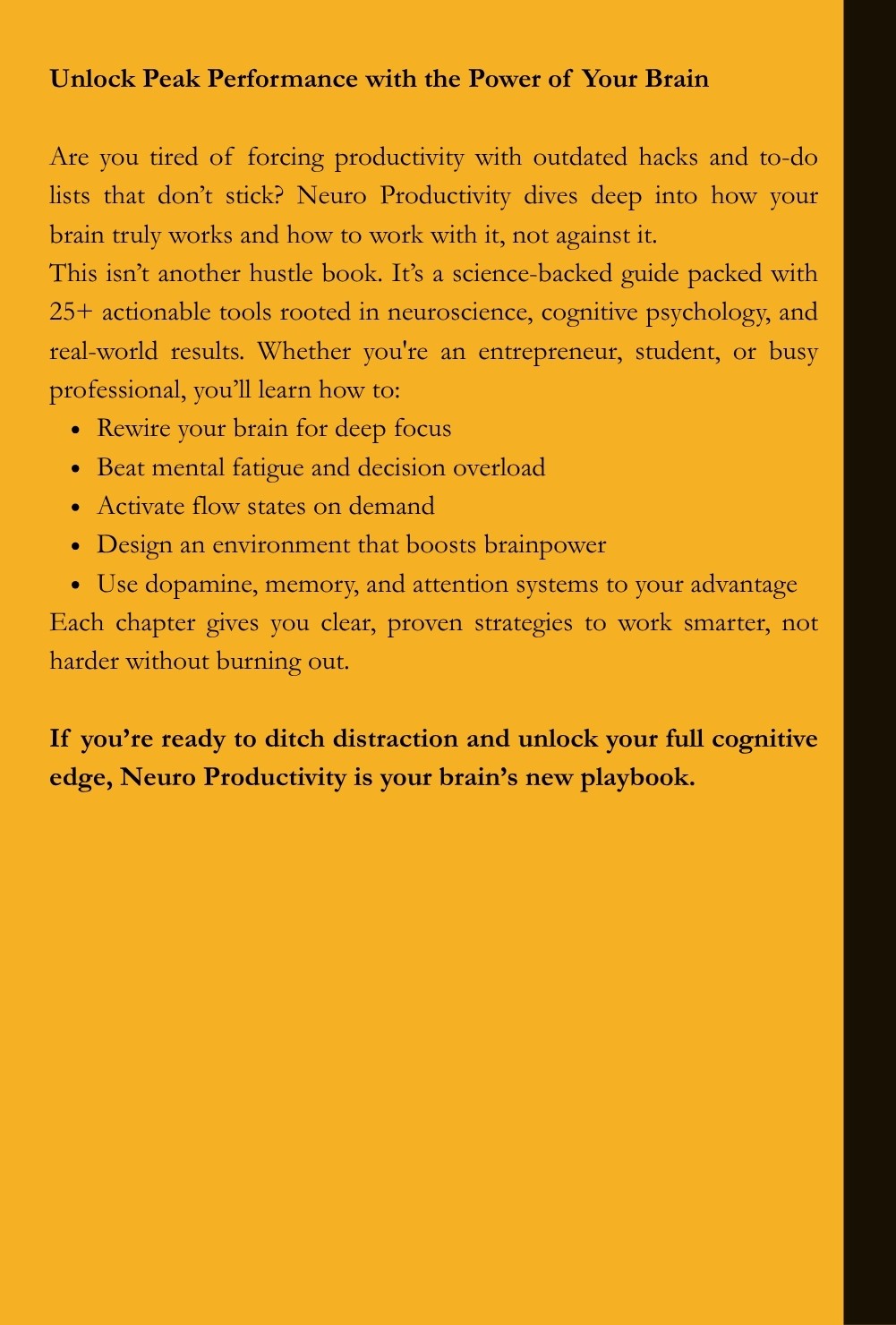 In a world of endless distractions and burnout, working harder is no longer the answer. Neuro Productivity rewires your approach with 25+ science-backed tools drawn from cutting-edge neuroscience, psychology, and behavioral research. Whether you're a busy professional, entrepreneur, student, or creative, this book gives you practical, brain-friendly strategies to: