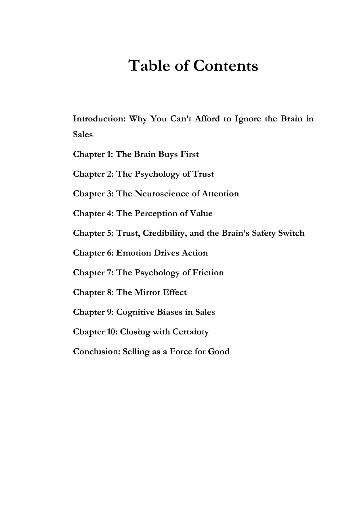 The book is a complete framework for brain-based selling from grabbing attention to building trust, shaping value, evoking emotion, removing friction, and closing with confidence.